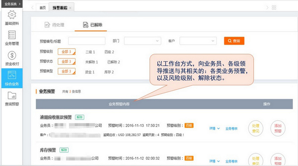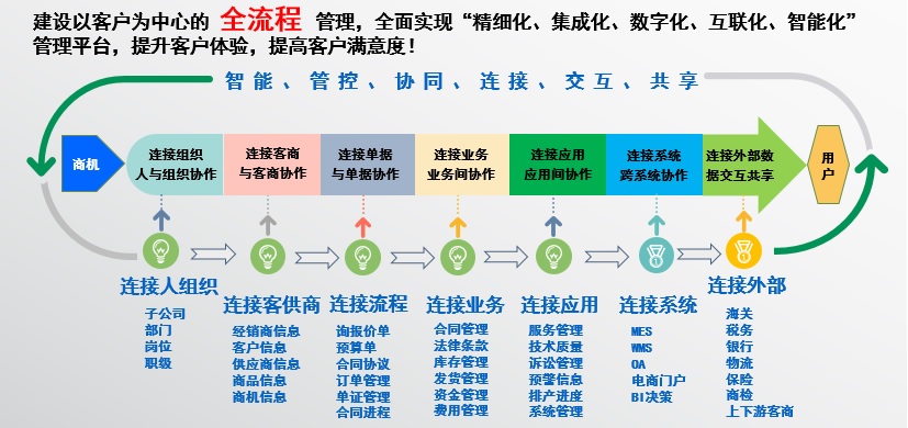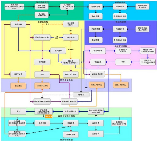 系统涵盖了绝大部分贸易类型的业务,可适用于各类贸易型企业的运营管理;系统包含:企业资源管理(含整合:保险、银行、税务、海关、外管、商检、货代物流、上下游客商等外部数据交换),客户商机管理,业务管理(平台支持:进口业务、出口业务、海外业务、内贸业务、加工业务、技术贸易、服务贸易、工程贸易等),财务管理,资金管理,物流管理,风险管理,单据文档管理,售后服务管理,报表管理,项目管理,资金占用利息,工资核算,固定资产,预算报销管理,决策分析,审批平台,业务进程,打印设计平台、查询分析平台,公告预警平台,系统平台,移动端审批、预警、查询等。