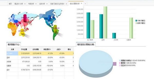 贸易ERP软件吸收上千家外贸公司的管理经验,设计分析报告树,提供了大量的统计分析模型,对公司的进出口、贸易数据进行统计分析或查询业务各环节的执行数据,以及贸易业务的各种要素(客户、订单、商品、贸易地区等)等进行趋势分析等。